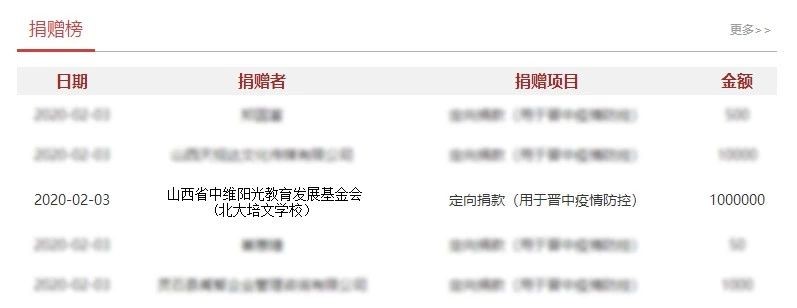2020年2月3日,山西省中維陽光教育發(fā)展基金會攜北大培文學(xué)校共同捐資人民幣100萬元,用于疫情防控工作。